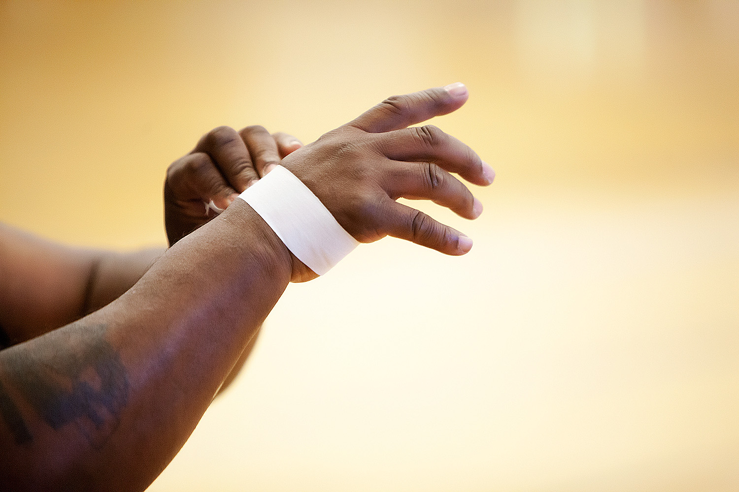 Derrick McMillon, a veteran from Peach Tree City, Georgia, prepares to play basketball at the GPS sports camp basketball workshop at the UA Rec Center. Photograph by John de Dios/UANews