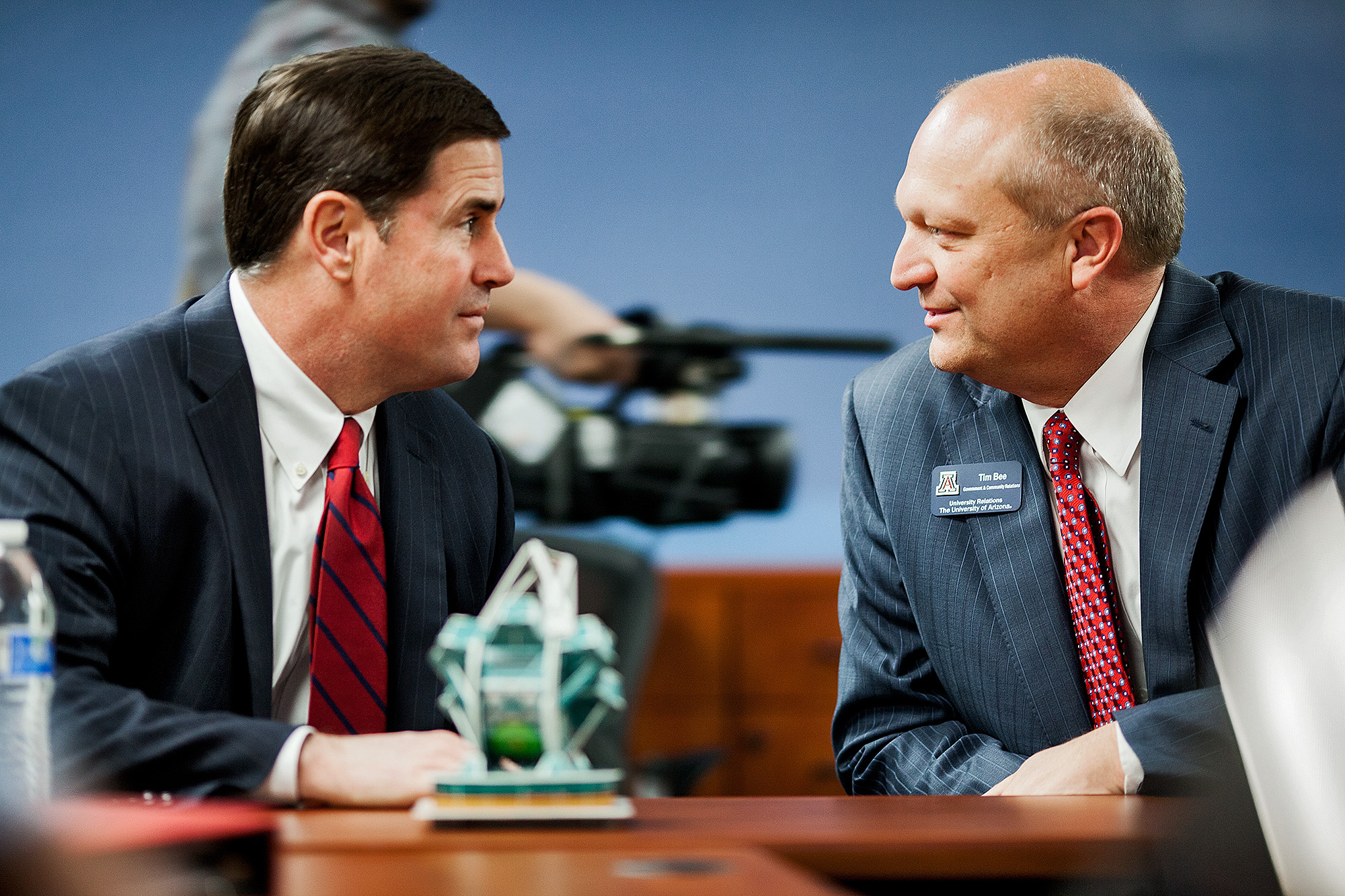 Gov. Doug Ducey visits with former Arizona Senate President Tim Bee at the University of Arizona in Tucson, Ariz.